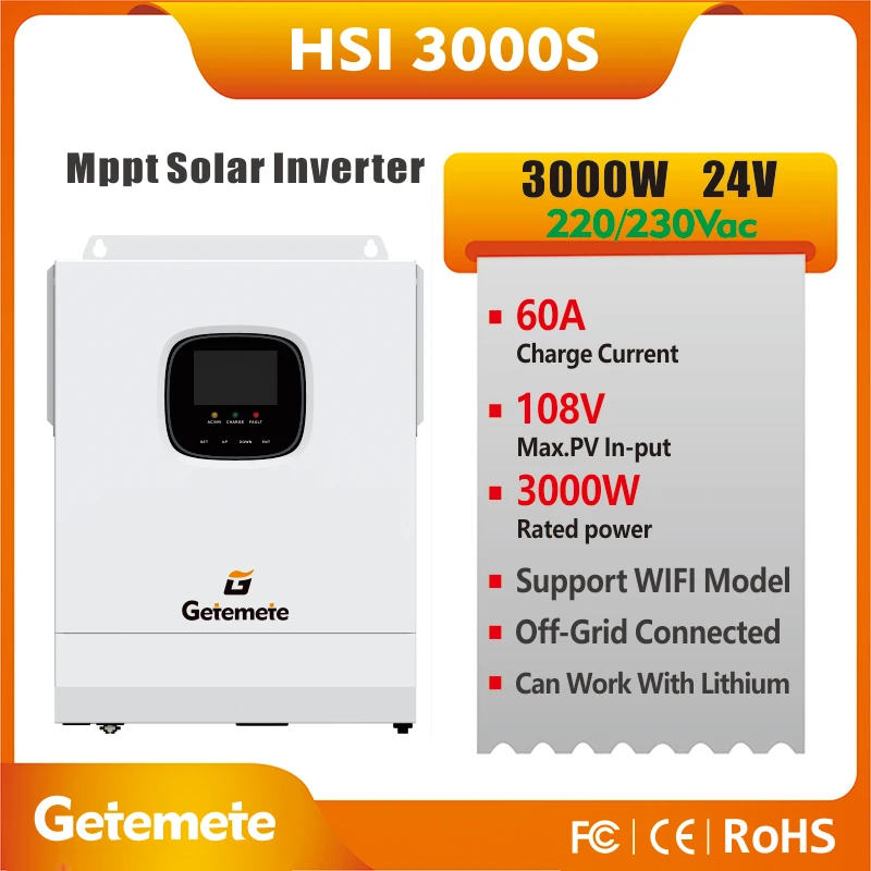 GTMT Off-Grid 3KW/3KVA MPPT 60A 24V 220/240V Solar inverter Dc to Ac Pure Sine Wave Power System PV Max Input 100VDC For SolarHSI 3000S