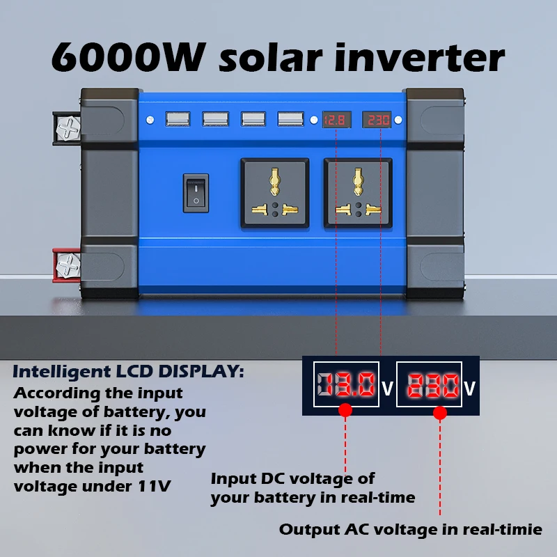[MCU LCD Display] Car inverter has the micro-control unit LCD realizes the exchange of human-machine information, and can know the working status of the inverter in real time, including show real time of input voltage, output voltage, output frequency, battery power, load, Power on/off indicator and other information.
