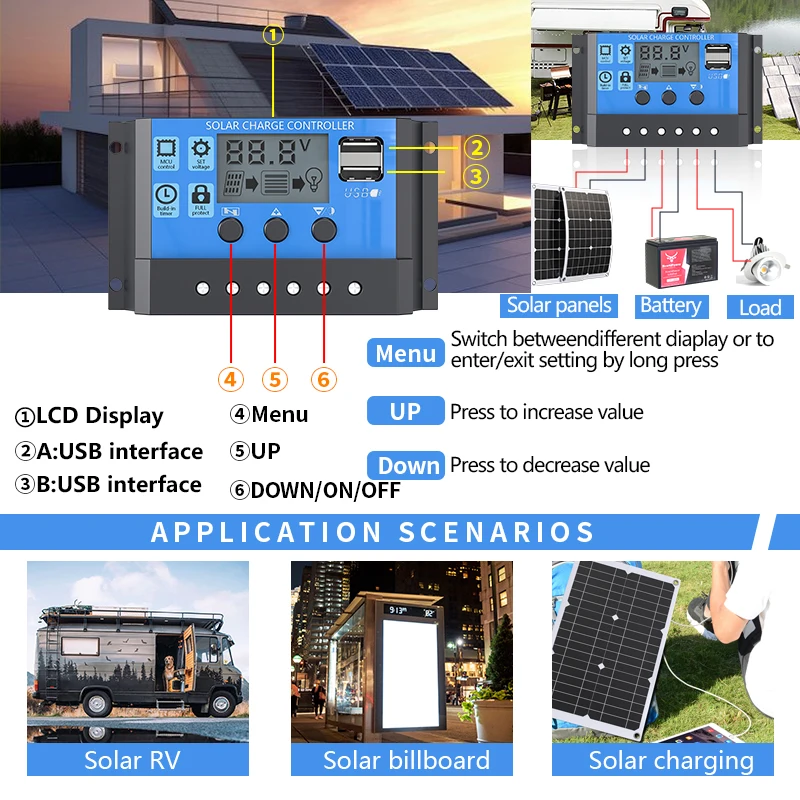 2. 100A 12V 24V Automatic Solar Charge Controller PWM with LCD Controller and Dual USB
