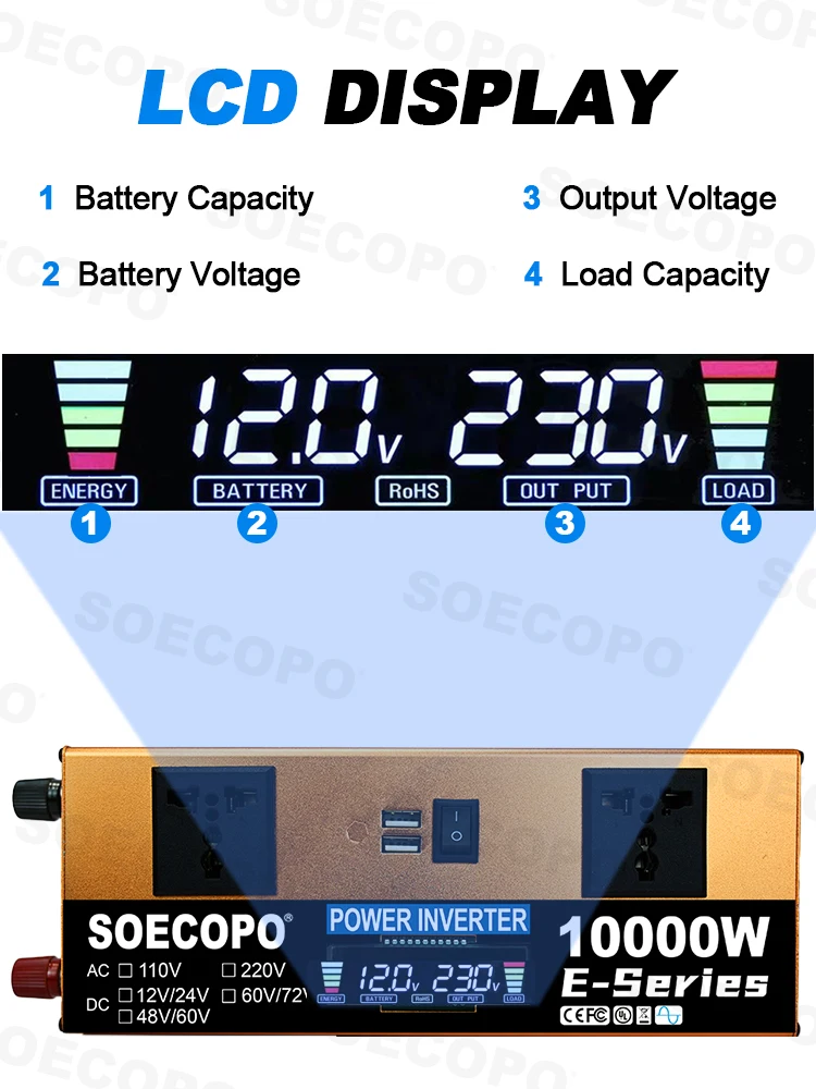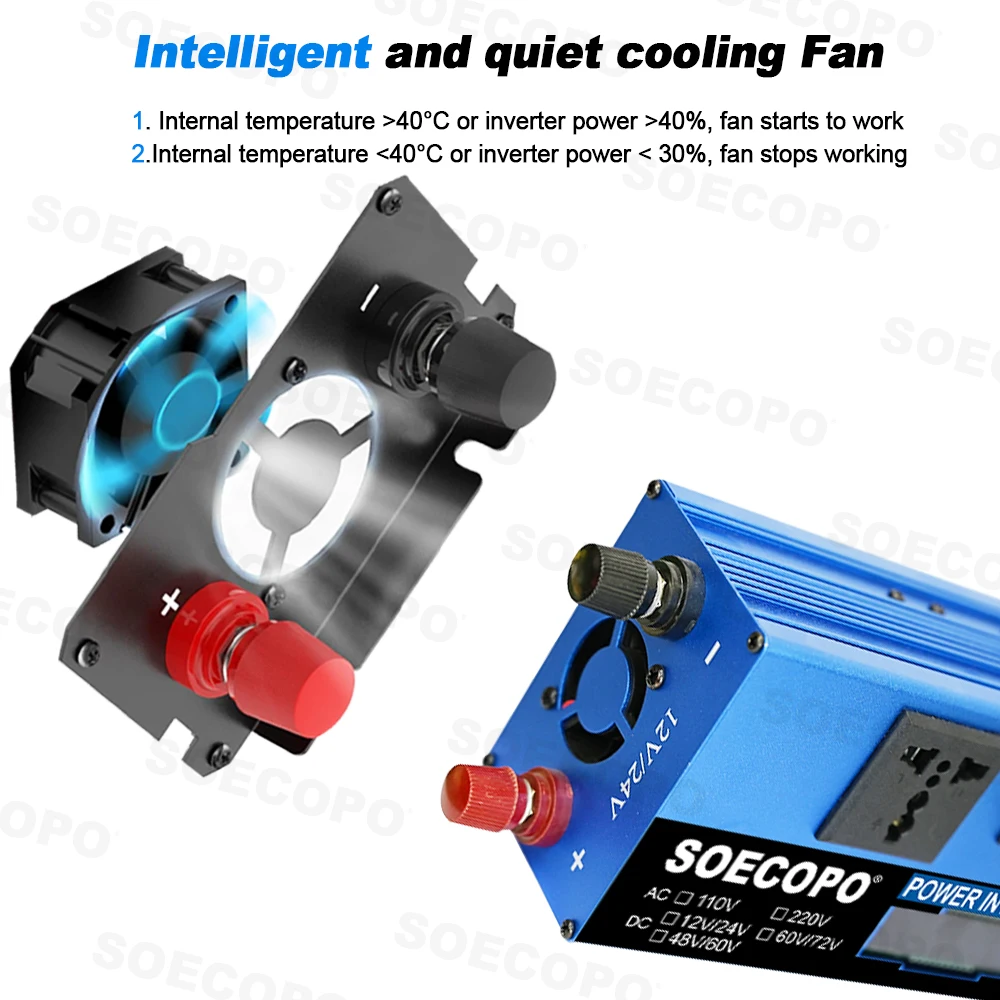 ▸Inverts 12V/24V DC to 110V/220V AC for high-power devices.