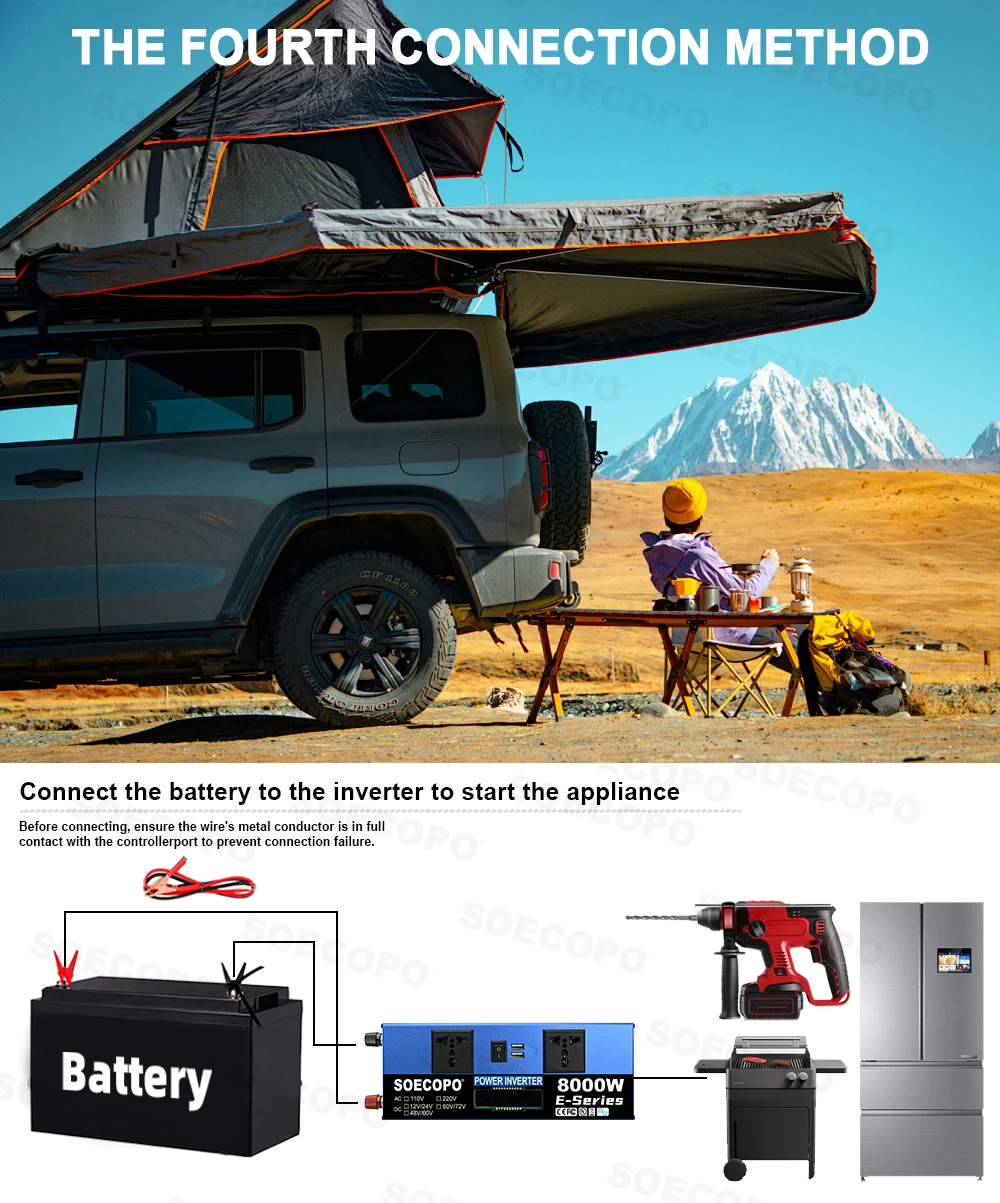 Never use: Air conditioners/electric kettles/hair dryers (start-up power over 2000W will burn out the inverter!)